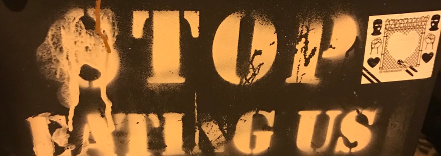 It looks like another quiet one, at first at least. I start by getting lost in the network of streets down the hill from the hostel, which is enlivened by seeing a massive feminist symbol on a wall (no idea how they did it.) After that I visit the squat, but no one answers my knock. I lose some time after on the phone, trying to diagnose computer issues from 300 miles away – a sign of my ego maybe that I even think it possible. But it’s good to keep in touch with my friends and smothers any discomfort I might feel at being alone. Eventually I wind up back at the squat, feeling like an overplayed record, banging on the door.